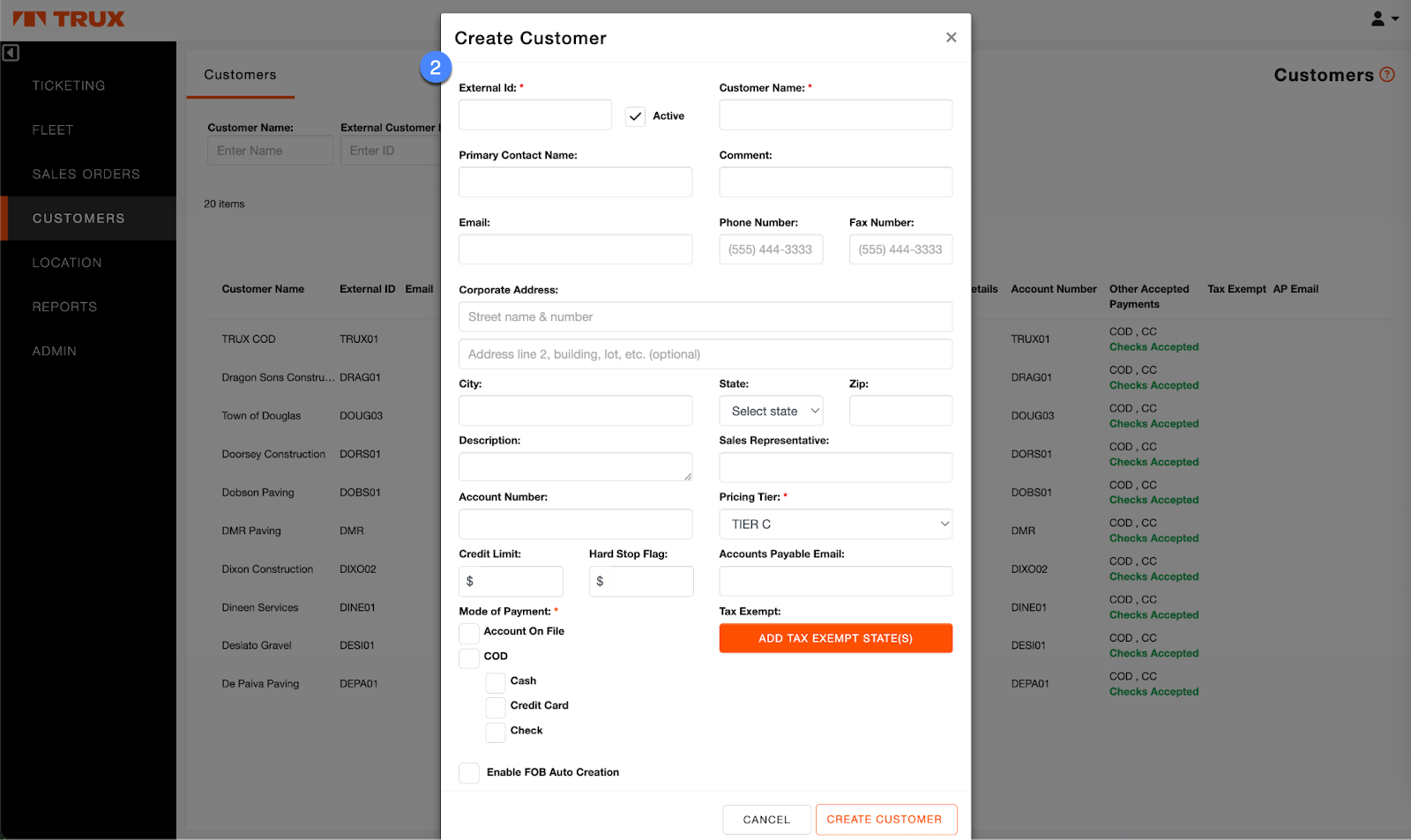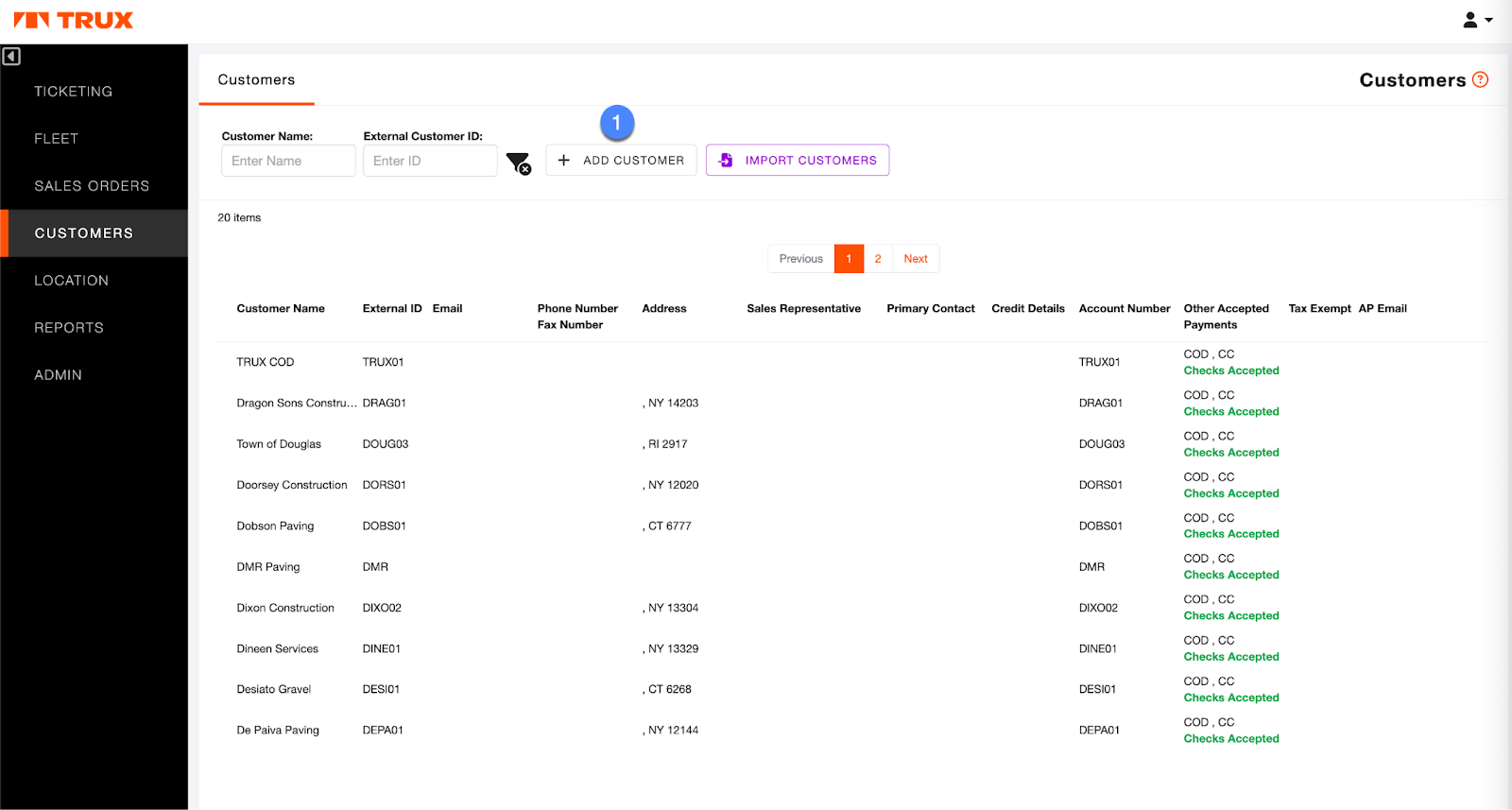Trux Ticketing supports advanced customer management functionality, including the ability to easily search for customers, view and manage customer-specific historical orders and pricing, and the ability to add and edit customer profiles. Users can create and edit customer profiles using one of two methods: manually adding via data entry/form and via bulk upload using a CSV template.