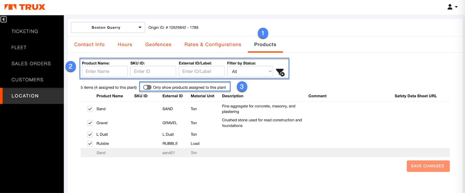 - Click the Products tab on the LOCATIONS screen to view all of the products available for the selected location. Location-specific products are added by users with the Customer Admin role when the location is created (see next section).