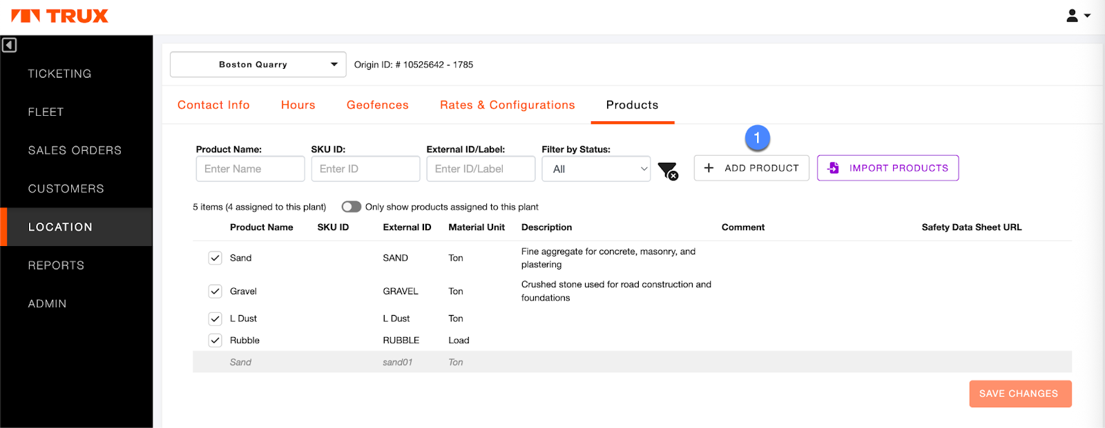 Users can view all products as well as those associated with a specific location on the LOCATIONS screen. Customer Admin users can create and manage products individually via form or in bulk via CSV file upload. Follow the steps below to see how.