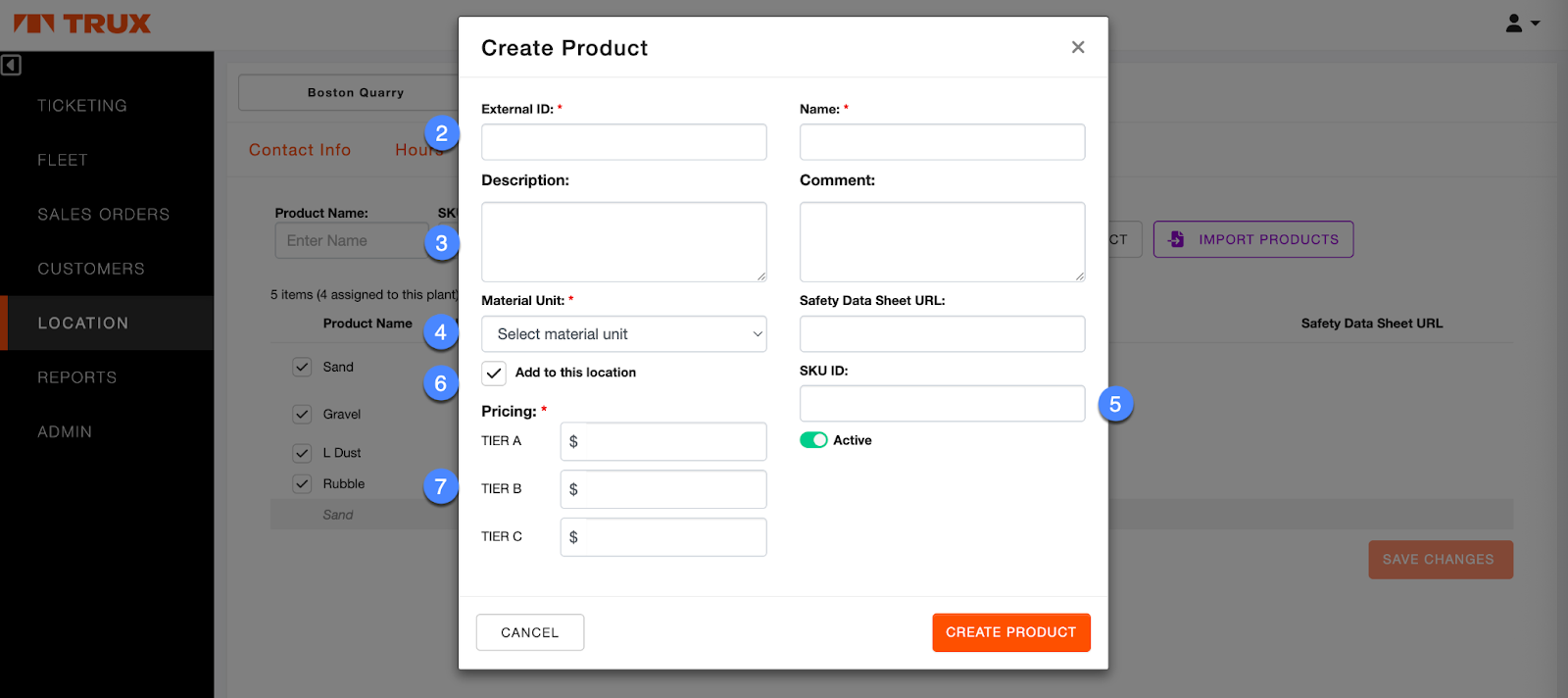 - Select the Material Unit for this product. This will essentially be how the product will be charged to customers: by the Ton, by the Cubic Yard, or by the Load. If you have a Safety Data Sheet for this product, copy and paste the URL in this field.